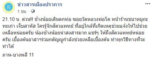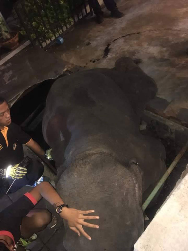 เมื่อวันที่ 14 กันยายน 2561 เฟซบุ๊ก ข่าวสารเมืองปราการ มีการรายงานว่า ที่หน้าร้านชบาหมูกะทะเก่า มีช้างน้อยเดินตกท่อ อาการสาหัส ต่อมาทีมสัตวแพทย์ เดินทางมาช่วยเหลือ ก่อนที่จะนำช้างขึ้นมาจากท่อได้ด้วยรถเครน