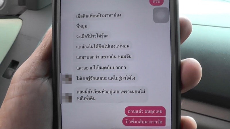 อย่างไรก็ตามขณะที่เดินกลับเข้าไปยังวัด คนขับรถได้รับข้อความจากเพื่อนที่ทำงานอยู่โรงพยาบาลทักษิณว่า "เมื่อคืนเพื่อนป๊ามาหาน้อง พี่หนุ่มจะเชื่อหรือเปล่าไม่รู้นะ
