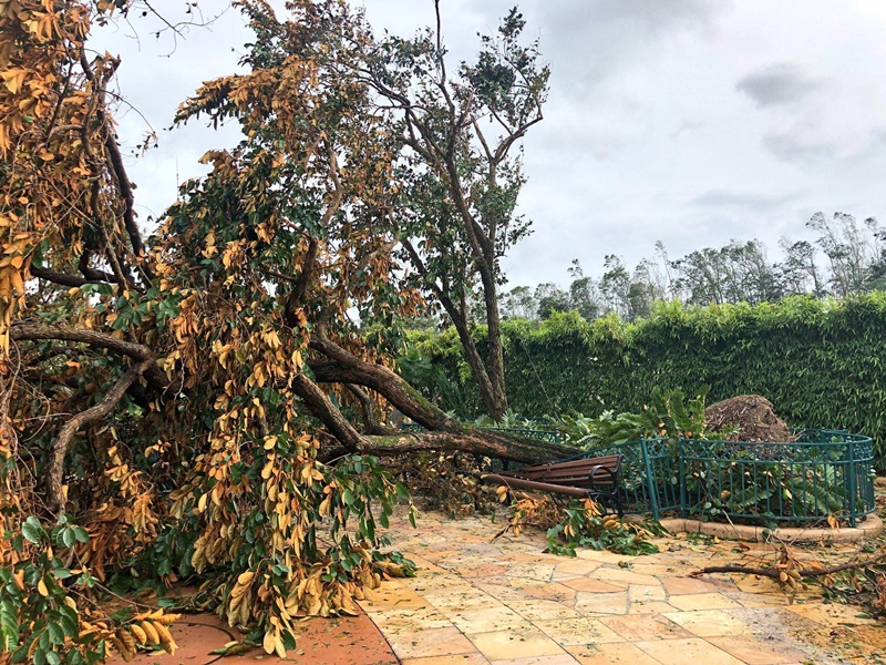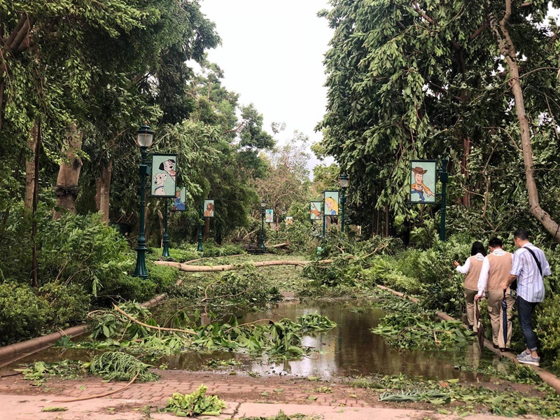 โดยมีพนักงานกำลังเร่งดำเนินการเก็บกวาดเศษซากใบไม้และต้นไม้ที่เกลื่อนกลาด