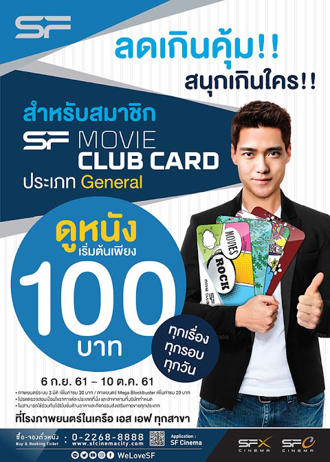 สมาชิก SF Movie Club ประเภท General รับสิทธิ์ชมภาพยนตร์ในราคาเริ่มต้นเพียง 100 บาท ทุกเรื่อง ทุกรอบ ทุกวัน ตั้งแต่วันที่ 6 กันยายน - 10 ตุลาคม 2561 คุ้มเกินคุ้มแบบนี้รีบสมัครเลย > https://goo.gl/WM2AtX