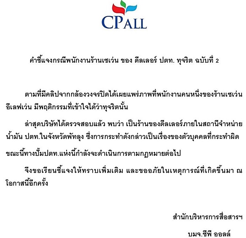 วันที่ 23 กันยายน 2561 สำนักบริหารการสื่อสารฯ บมจ.ซีพี ออลล์ ได้มีการชี้แจงผ่านทางเฟซบุ๊ก CPALL โดยระบุว่า คำชี้แจงกรณีพนักงานร้านเซเว่นของดีลเลอร์ ปตท. ทุจริต ฉบับที่ 2 ตามที่มีคลิปจากกล้องวงจรปิดได้เผยแพร่ภาพที่พนักงานคนหนึ่งของร้านเซเว่นอีเลฟเว่น มีพฤติกรรมที่เข้าใจได้ว่าทุจริตนั้น