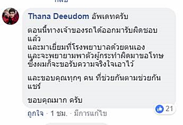 ต่อมา ทางเฟซบุ๊ก Thana Deeudom ของผู้เสียหาย ระบุว่า ล่าสุดทางคู่กรณีได้ออกมารับผิดชอบแล้วและมาเยี่ยมที่โรงพยาบาลด้วยตัวเอง