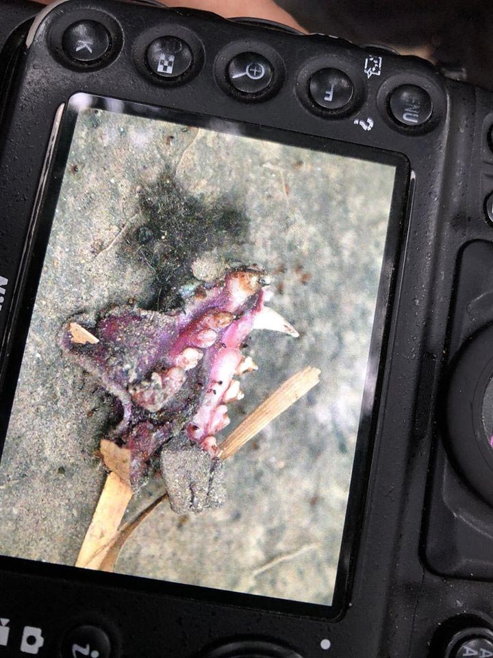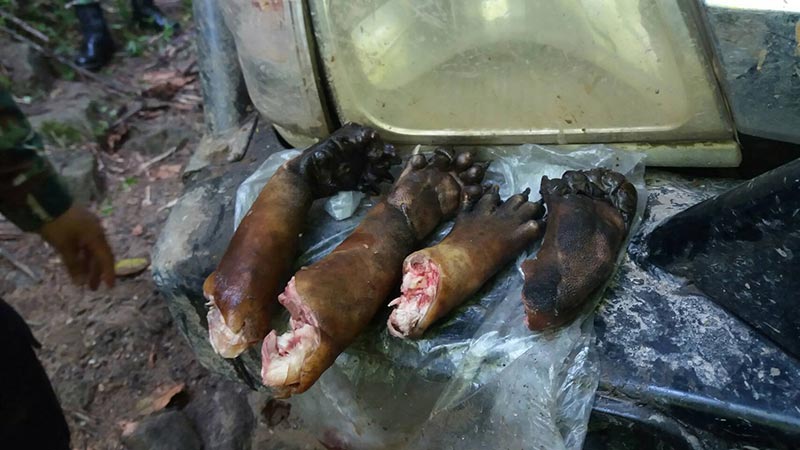 ทั้งนี้ จากการกระจายกำลังค้นหาหลักฐานในบริเวณโดยรอบสำนักสงฆ์ พบร่องรอยการก่อกองไฟเพื่อใช้ในการประกอบอาหาร พบเศษซากชิ้นเนื้อ ขนสัตว์ เศษกระดูก และกรามล่างของสัตว์ไม่ทราบชนิด เจ้าหน้าที่จึงทำการเก็บรวบรวมเพื่อนำไปตรวจพิสูจน์ดีเอ็นเอว่าตรงกับซากอุ้งเท้าหมีขอ จำนวน 4 ข้าง หรือไม่