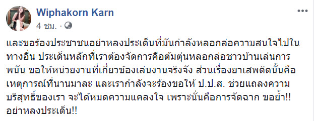 ทั้งนี้ กานต์ ได้ฝากถึงประชาชนว่า อย่าหลงประเด็นที่อีกฝ่ายกำลังหลอกล่อความสนใจไปในทางอื่น ประเด็นหลักที่ต้องจัดการคือต้มตุ๋นหลอกล่อชาวบ้านเล่นการพนัน ขอให้หน่วยงานที่เกี่ยวข้องเล่นงานจริงจัง ส่วนเรื่องยาเสพติดนั้นคือเหตุการณ์ที่นานมาแล้ว และตนกำลังจะร้องขอให้ ป.ป.ส. ช่วยแถลงความบริสุทธิ์ของตน จะได้หมดความแคลงใจ เพราะนั่นคือการจัดฉาก และทิ้งท้ายเกี่ยวกับเรื่องนี้ว่า "เพื่อให้หายเคลือบแคลงใจ ตอนนี้กำลังประสาน สน. และ ป.ป.ส. ให้จัดการเรื่องนี้ค่ะ ว่าเราได้ไปให้การตรวจสารยืนยันความบริสุทธิ์เป็นที่เรียบร้อยแล้ววันก่อนเร็ว ๆ นี้ เค้าแนะนำให้ออกสื่อแต่กานต์ไม่ออกเพราะไม่ได้เป็นเรื่องดี แต่ตอนนี้คงจำเป็นต้องรบกวนให้ทางท่านช่วยให้ข่าวออกสื่อด้วยค่ะ เพราะมันไม่มีอะไรเกี่ยวข้องกับกานต์"
