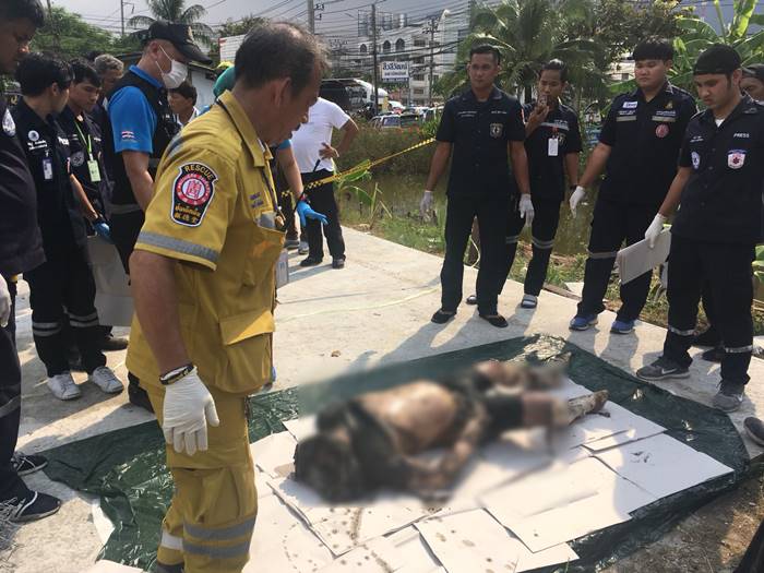 เจ้าหน้าที่ได้กระจายกำลังกันตรวจสอบพื้นที่โดยรอบ จนกระทั่งพบศพชายไม่ทราบชื่อ อยู่ในบ่อเกรอะ ห่างจากจุดที่พบคราบเลือดไปประมาณ 2 เมตร ปากบ่อเส้นผ่าศูนย์กลาง กว้าง 80 เซนติเมตร ลึก 4 เมตร สภาพศพอยู่ในลักษณะหัวทิ่มลงไปด้านล่าง ปลายเท้าชี้ขึ้นฟ้า เจ้าหน้าที่จึงช่วยกันนำศพขึ้นมาข้างบน โดยจากการตรวจสอบสภาพศพ พบร่องรอยถูกแทงด้วยของมีคมหลายแห่งทั่วร่างกาย บริเวณช่องท้อง 5 แผล บริเวณแขนซ้าย 1 แผล นอกจากนี้แล้ว บริเวณศีรษะ ยังมีร่องรอยถูกอาวุธมีคมกระหน่ำฟันจนแหลกเละ