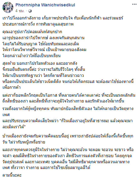 เมื่อวันที่ 26 ตุลาคม 2561 เจ้าของเฟซบุ๊ก Phornnipha Wanichwisedkul ได้โพสต์ชี้แจงประเด็นที่หลาย ๆ คน กำลังวิพากษ์วิจารณ์ กรณีชุดกีฬา ที่เจ้าตัวใส่ในงานวิ่งแห่งหนึ่ง จนเกิดกระแสดังกล่าว ซึ่งชาวเน็ตเข้ามาแสดงความคิดเห็นอย่างมากมาย ทั้งเห็นด้วยและไม่เห็นด้วยพร้อมแนะเรื่องการแต่งกายที่เหมาะสม พร้อมยังยกตัวอย่างเช่น ก้อย รัชวิน เป็นต้น