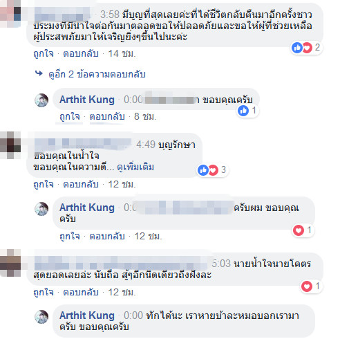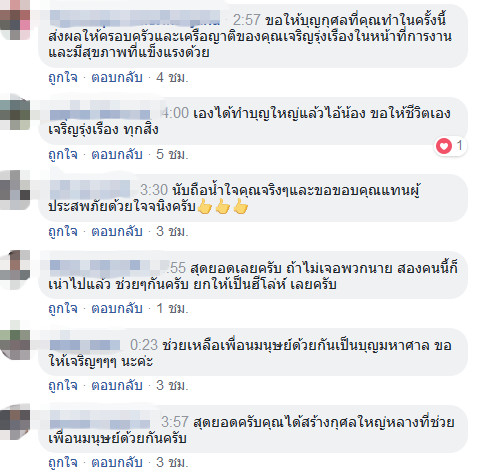 ในขณะเดียวกันชาวเน็ตมากมายเข้ามาแสดงความคิดและขอบคุณเจ้าของเรื่องที่ช่วยเหลือหนุ่มทั้งสองคนโดยที่ไม่รู้จัก และพาส่งโรงพยาบาลจนปลอดภัย กลายเป็นอีกเหตุการณ์ที่มีการแชร์และชื่นชมเป็นจำนวนมาก