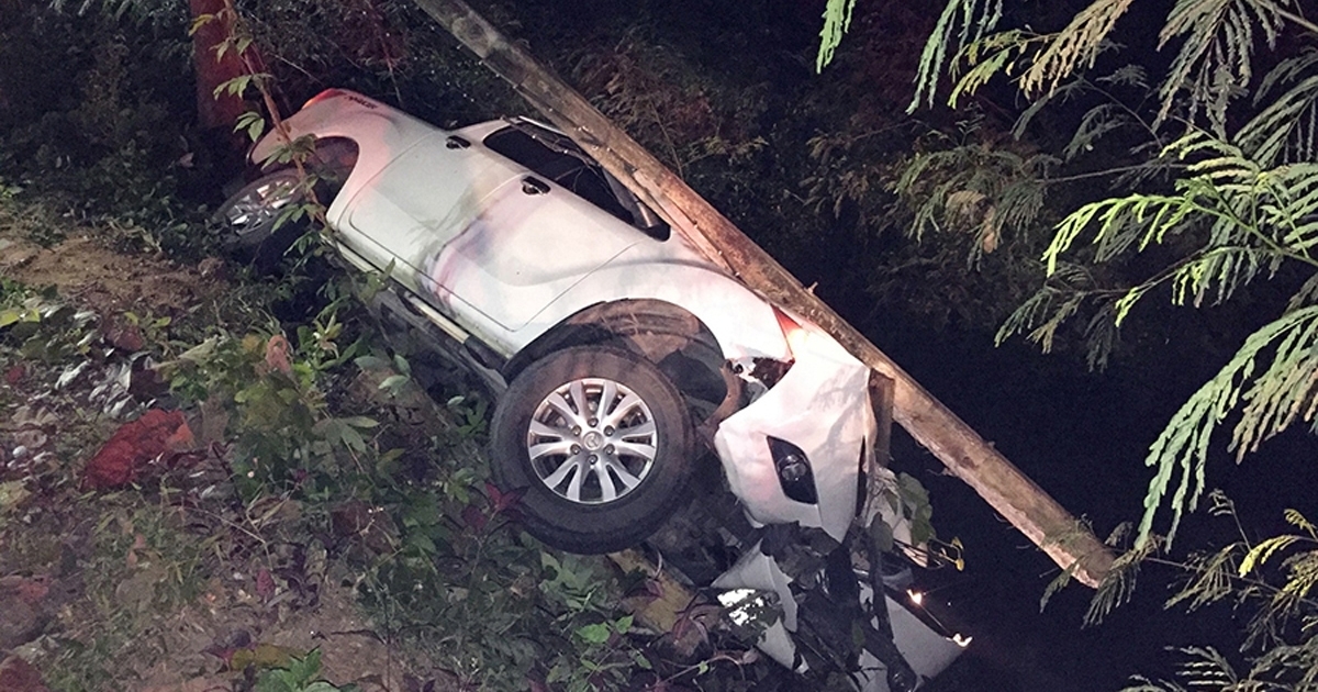 อุบัติเหตุระทึก ครูโรงเรียนเอกชนขับกระบะชนเสาไฟฟ้า รถพุ่งไปนอนตะแคงในคู กู้ภัยรุดช่วยอย่างทุลักทุเลเพราะพื้นที่ลาดชันมาก เจ้าตัวคุมสติไม่ได้ ร้องหาสามีตลอด ขอโทษที่ทำลูกสาวที่นั่งมาด้วย บาดเจ็บ