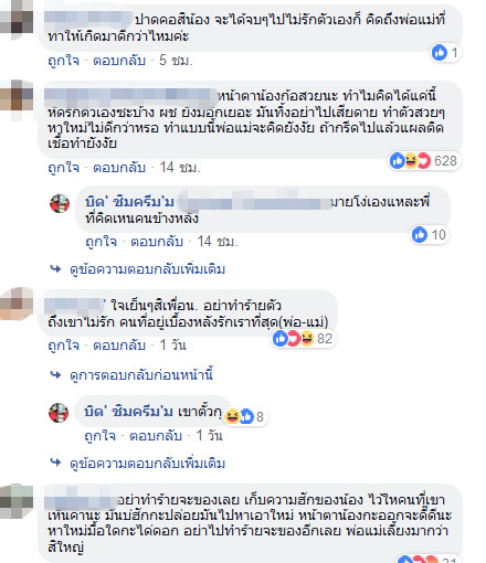 ซึ่งชาวเน็ตเข้ามาแสดงความคิดเห็นนับหมื่น และแชร์อีกกว่าสามหมื่นครั้ง คงเป็นเรื่องที่ใกล้ตัวหลาย ๆ คน ทำให้ชาวเน็ตเข้ามาให้กำลังใจพร้อมกับเตือนสติสาววัยรุ่นคนนี้ แต่ก็มีอีกส่วนที่ตั้งคำถามกับการกระทำแบบไร้สติ พร้อมกับขอให้พูดความจริงว่าเกิดอะไรขึ้นกันแน่