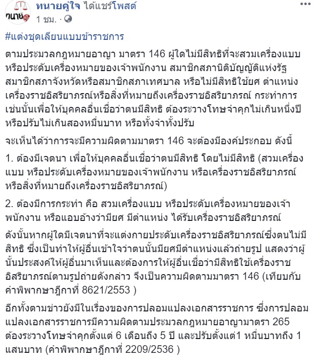 ทนายคู่ใจ โพสต์เตือนแต่งกายเลียนแบบข้าราชการประดับเครื่องราชอิสริยาภรณ์ ผิดกฎหมาย มีโทษทั้งจำและปรับ หลังมีภาพชายวัย 24 อ้างเป็นชำนาญการ ซี 8