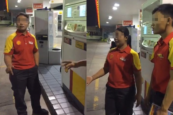 พนักงานชายท่าทางไม่พอใจมาก และแตะหัวจ่ายน้ำมันไป 1 ที แต่ก็กล่าวขอโทษ