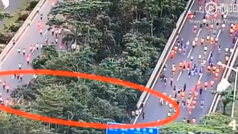 กลุ่มนักวิ่งฮาล์ฟมาราธอนในเซินเจิ้น ประเทศจีน แอบวิ่งลัดป่าไม้ข้างทาง ตัดข้ามมาอีกฝั่ง คิดว่าไม่มีใครรู้ แต่กล้องวงจรปิดจับภาพได้ รวมมากกว่า 250 คน