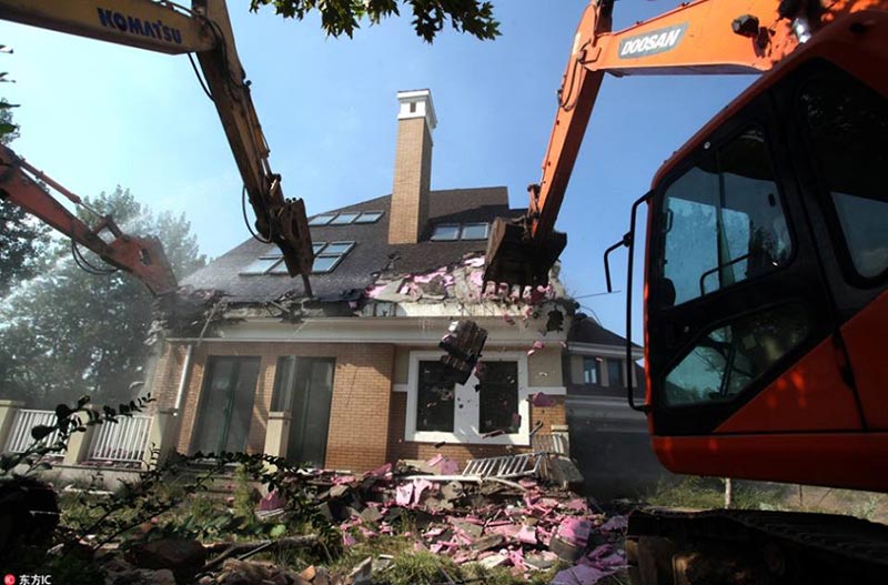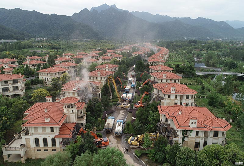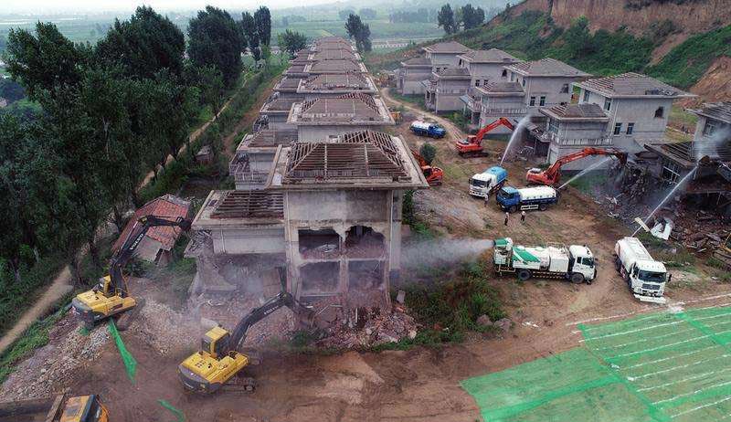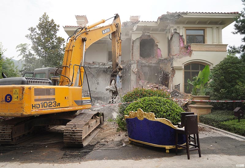 อาคารผิดกฎหมายแห่งแรกที่ถูกรื้อถอนคือ โครงการหมู่บ้านฉวินเสียนเปี๋ยเย่ ซึ่งมีคฤหาสน์หรู 65 หลัง และอาคารทำการอีก 1 หลัง รัฐบาลได้จัดการรื้อถอนเสร็จสิ้นแล้ว ขณะนี้กำลังอยู่ในช่วงเข้าไปปรับปรุงฟื้นฟูพื้นที่ให้กลับมาเป็นพื้นที่สีเขียวอีกครั้ง