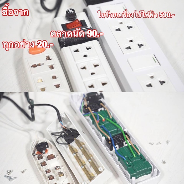 โดยในภาพจะเห็นได้ว่าเจ้าของโพสต์ได้นำปลั๊กไฟสามตามาแกะดูไส้ใน ซึ่งเรียงลำดับจากของราคาถูกไปถึงราคาแพงสุด โดยราคาถูกสุดซื้อในร้านทุกอย่าง 20 บาท ถัดมาคือซื้อที่ตลาดนัด และซื้อที่ร้านเครื่องใช้ไฟฟ้า พบว่า ของที่ซื้อในร้านทุกอย่าง 20 บาท และซื้อที่ตลาดนัด มีการเดินขั้วไฟแบบโง่ ๆ ช่องสายดินก็ใส่มาหลอก ๆ แต่สำหรับอันที่แพงสุด มีเบรกเกอร์ตัดไฟ มีการเดินสายอย่างดี ดังนั้นอย่าประหยัดกับเรื่องระบบไฟฟ้า เพราะจากที่มีข่าวไฟฟ้าลัดวงจร ก็มาจากปลั๊กไฟราคาถูกทั้งนั้น