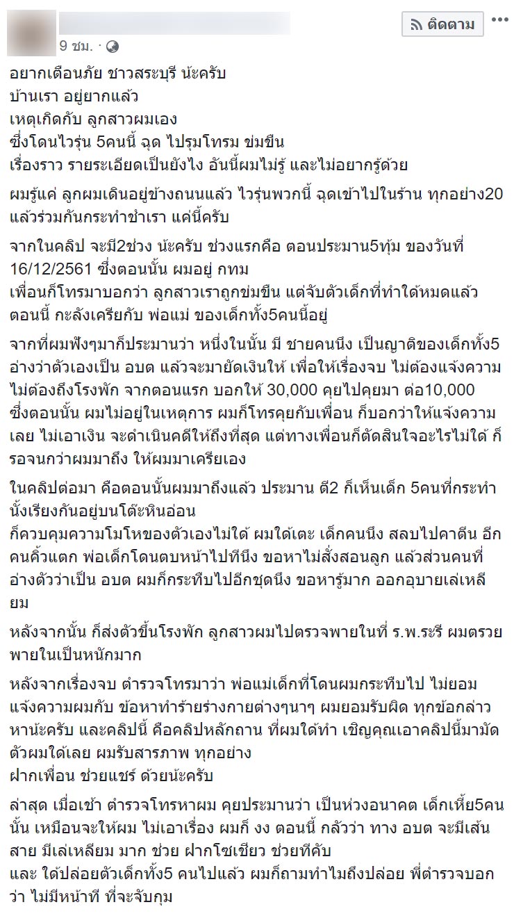 ทั้งนี้ สาเหตุที่โพสต์เพื่อร้องขอความช่วยเหลือ เนื่องจากกลัวว่าจะไม่ได้รับความเป็นธรรม เพราะวันที่เกิดเหตุทางญาติของหนึ่งในผู้ก่อเหตุ อ้างตัวว่าเป็น อบต. พยายามจะยัดเงินให้เรื่องจบ ในตอนแรกบอกจะให้ 30,000 บาท แต่คุยไปคุยมาต่อเหลือ 10,000 บาท ซึ่งตนก็ไม่ยอมตั้งแต่แรกแล้ว เพราะยืนยันจะเอาเรื่องให้ถึงที่สุด แต่กลับถูกพ่อแม่ของผู้ก่อเหตุจะแจ้งความจับข้อหาทำร้ายร่างกาย เนื่องจากวันที่เกิดเหตุตนโมโหที่ลูกสาวถูกทำร้าย จึงทำร้ายวัยรุ่นคนก่อเหตุจนสลบ ประกอบกับทางเจ้าหน้าที่ตำรวจได้มีการปล่อยตัววัยรุ่นทั้ง 5 คน ที่ก่อเหตุไปแล้ว โดยอ้างว่าไม่มีหน้าที่จับกุม