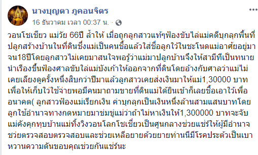 กลายเป็นเรื่องราวชวนสะเทือนใจไม่น้อย กรณีผู้ใช้เฟซบุ๊ก นางบุญตา ภูคอนจิตร ตีแผ่เหตุการณ์ที่ยายวัย 66 ปี ซึ่งปลูกบ้านอาศัยในที่ดินของลูกสาว แต่ต่อมากลับถูกลูกแท้ ๆ ฟ้องร้องข้อหาบุกรุก และให้จ่ายเงิน 1.3 ล้านบาท ไม่เช่นนั้นจะต้องติดคุก