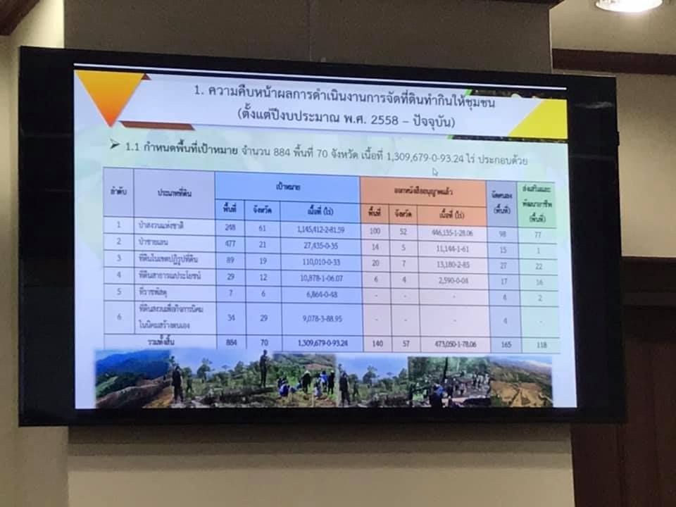 วันที่ 20 ธันวาคม 2561 สำนักข่าวไทย รายงานว่า กระทรวงทรัพยากรธรรมชาติและสิ่งแวดล้อม ร่วมกับคณะกรรมการนโยบายที่ดินแห่งชาติ (คทช.) และหน่วยงานที่เกี่ยวข้อง รายงานความคืบหน้าผลการจัดที่ดินทำกินให้ชุมชน ตั้งแต่ปีงบประมาณ 2558-ปัจจุบัน ซึ่งกำหนดพื้นที่เป้าหมายไว้ 884 พื้นที่ ใน 70 จังหวัด รวม 1.3 ล้านไร่