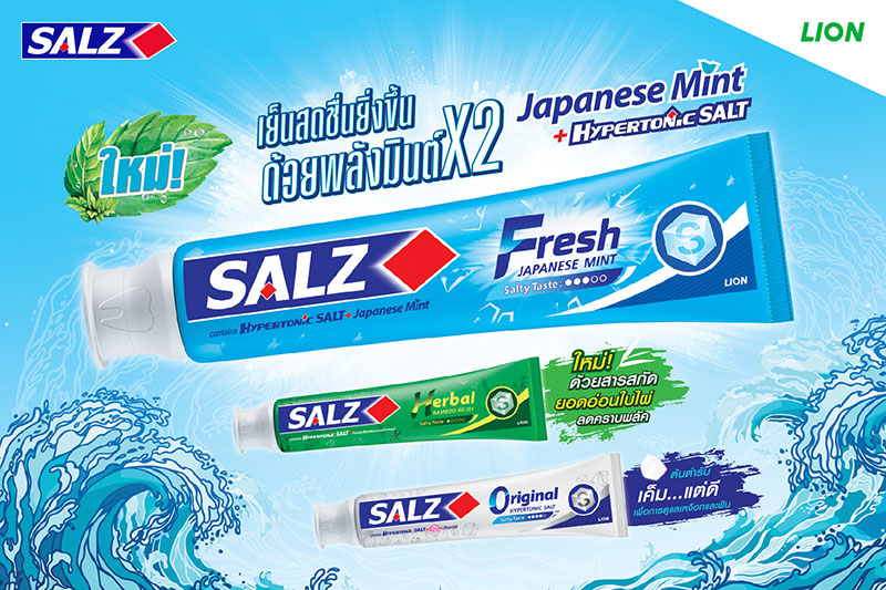 บริษัท ไลอ้อน (ประเทศไทย) จำกัด ขอแนะนำ ยาสีฟันซอลส์ เฟรช แจเปนนิส มินต์ โฉมใหม่มาพร้อมสูตรใหม่ ด้วยพลังมินต์สายพันธุ์ญี่ปุ่น ช่วยคงความเย็นสดชื่นยาวนานขึ้น มาพร้อมกับพลังเกลือตัวจริงอย่าง Hypertonic Salt ที่มีอณูเล็กซึมลึก ช่วยลดการสะสมของแบคทีเรียสาเหตุของกลิ่นปาก ช่วยให้ปากหอม มั่นใจ เพื่อเหงือกดี ฟันดี