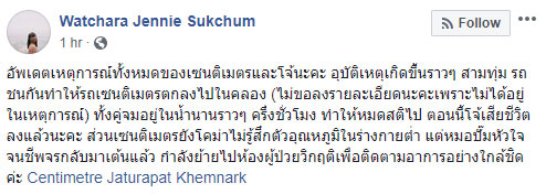 ทั้งนี้ เจนนี่ ปาหนัน พิธีกรดัง ซึ่งทำรายการ ล้นตู้ ร่วมกัน ได้โพสต์อัปเดตเกี่ยวกับเรื่องนี้ ระบุว่า "อัปเดตเหตุการณ์ทั้งหมดของเซนติเมตรและโจ้นะคะ อุบัติเหตุเกิดขึ้นราว ๆ สามทุ่ม รถชนกันทำให้รถเซนติเมตรตกลงไปในคลอง (ไม่ขอลงรายละเอียดนะคะเพราะไม่ได้อยู่ในเหตุการณ์) ทั้งคู่จมอยู่ในน้ำนานราว ๆ ครึ่งชั่วโมง ทำให้หมดสติไป ตอนนี้โจ้เสียชีวิตลงแล้วนะคะ ส่วนเซนติเมตรยังโคม่าไม่รู้สึกตัว อุณหภูมิในร่างกายต่ำ แต่หมอปั๊มหัวใจจนชีพจรกลับมาเต้นแล้ว กำลังย้ายไปห้องผู้ป่วยวิกฤตเพื่อติดตามอาการอย่างใกล้ชิดค่ะ"