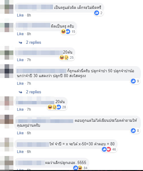 ด้านผู้ที่ได้อ่านโจทย์ข้อดังกล่าว มองว่า ที่ครูให้ผิดเพราะเรียงสมการวิธีทำผิด คำตอบที่ถูกต้องต้องเป็น x-50 = 30