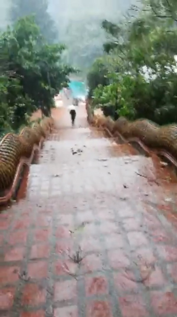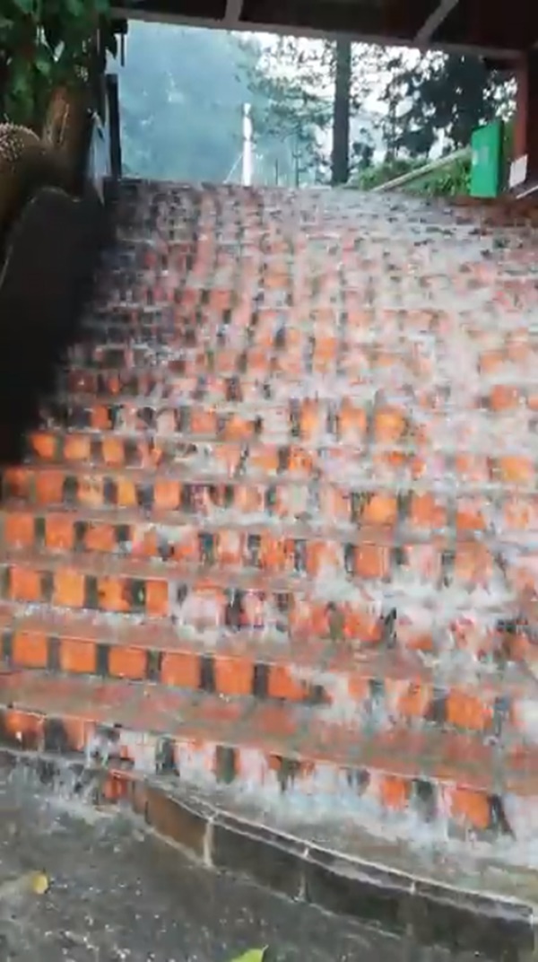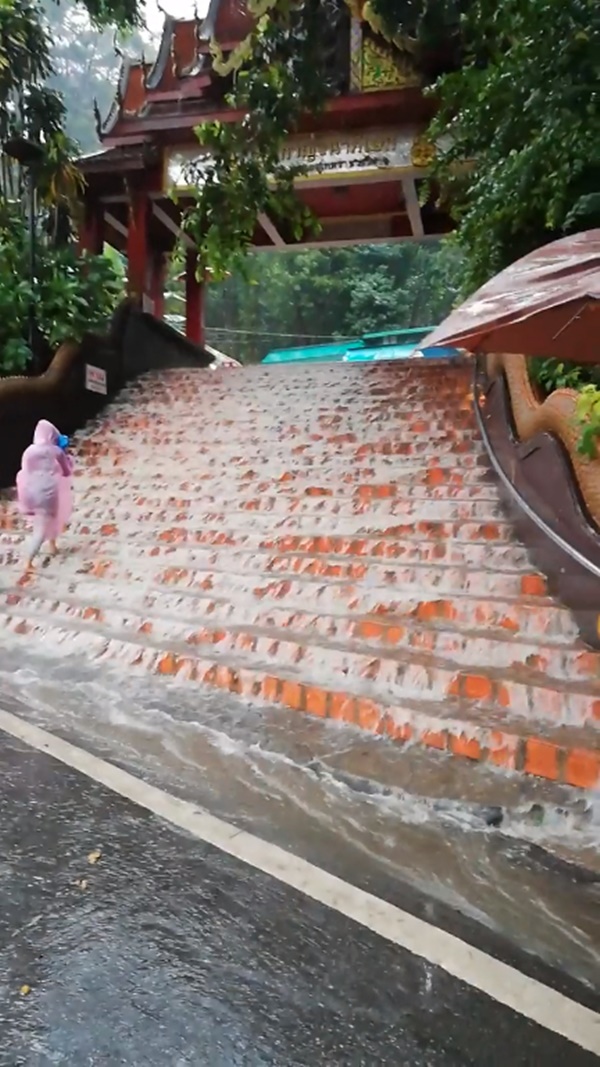 ท่ามกลางฝนที่ตกหนัก เผยให้เห็นน้ำไหลลงบันไดอย่างชัดเจนเช่นกัน ทั้งนี้