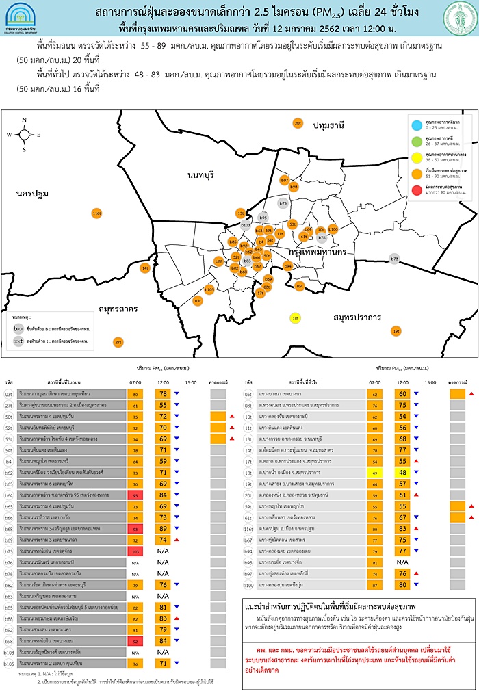 วันที่ 12 มกราคม 2562 กรมควบคุมมลพิษ รายงานสถานการณ์ฝุ่นละออง