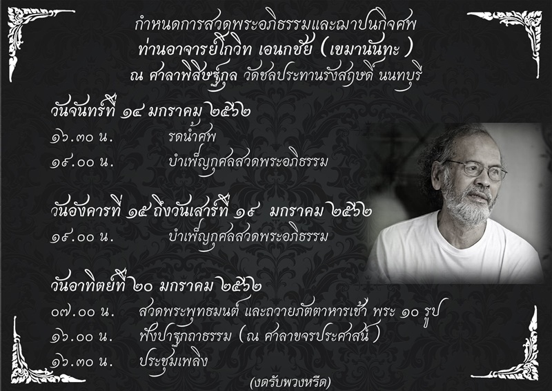 โกวิท เอนกชัย หรือ เขมานันทะ ศิลปินแห่งชาติ สาขาวรรณศิลป์ 2550 เสียชีวิตในวัย 80 ปี จัดพิธีศพ ณ ศาลาพิสิษฐ์กุล วัดชลประทานรังสฤษดิ์