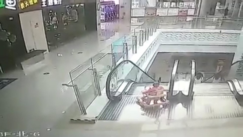 และไถลลงบันไดเลื่อนจนล้มหัวทิ่มหัวตำทั้งรถและเด็ก
