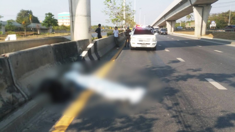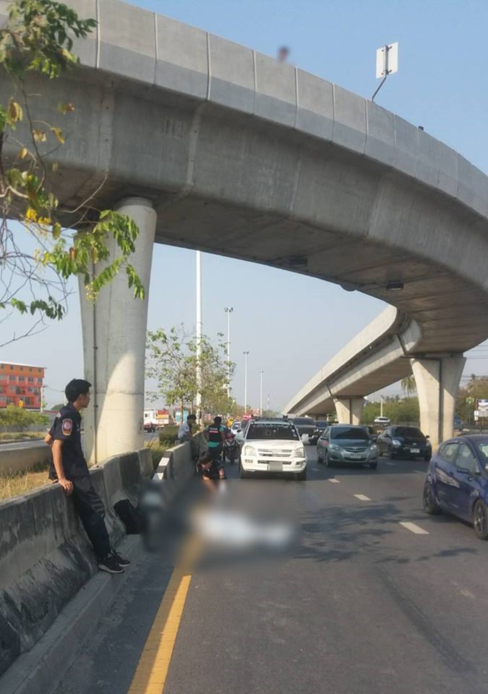 หนุ่มขี่รถจักรยานยนต์ขึ้นสะพานกลับรถถนนราชพฤกษ์ คุมรถไม่อยู่พุ่งชนขอบกั้น ร่างกระเด็นร่วงพื้นถนนดับคาที่