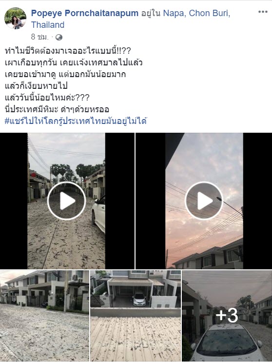แม้จะมีการรณรงค์อย่างต่อเนื่อง แต่ล่าสุด (3 กุมภาพันธ์ 2562) ผู้ใช้เฟซบุ๊ก Popeye Pornchaitanapum ได้เผยภาพชวนตกใจไม่น้อย หลังท้องฟ้าหมู่บ้านหรูแห่งหนึ่งใน จ.ชลบุรี กลับเต็มไปด้วยฝุ่นควันจากการเผาอ้อย ที่หนักสุดคือเศษละอองสีดำจากการเผาลอยฟุ้งและร่วงมาทั่วบริเวณหมู่บ้าน นอกจากจะเสียสุขภาพแล้ว ยังสร้างความสกปรกให้กับพื้นที่เป็นบริเวณกว้างอีกด้วย