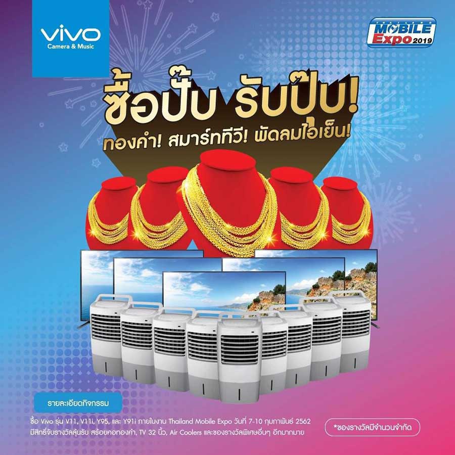 - ผู้ที่มีสิทิ์จับฉลากร่วมลุ้นรางวัล ต้องเป็นผู้ที่ซื้อ Vivo เฉพาะรุ่น V11, V11i, Y95, Y91 และ Y91i จากทุกบูธภาย ในงาน Thailand Mobile Expo 2019 วันที่ 7-10 กุมภาพันธ์ 2562 เท่านั้น