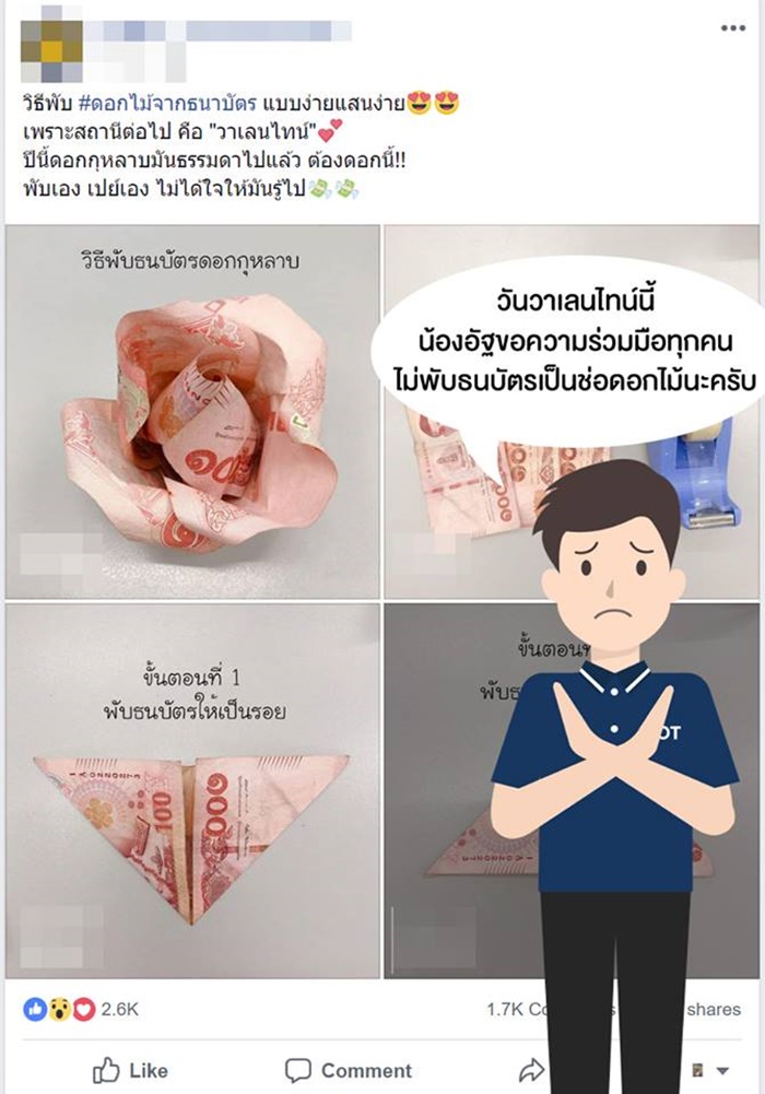 ล่าสุด (7 กุมภาพันธ์ 2562) ธนาคารแห่งประเทศไทย (ธปท.) โพสต์ข้อความผ่าน เฟซบุ๊ก ธนาคารแห่งประเทศไทย - Bank of Thailand ขอความร่วมมืองดนำธนบัตรมาพับเป็นช่อดอกไม้ เนื่องจากจะทำให้ธนบัตรชำรุดเร็วขึ้น โดยระบุข้อความว่า "ธนบัตรที่มีการขีดเขียน ประทับตรา พับประดิษฐ์ สิ่งเหล่านี้ทำให้ธนบัตรชำรุดก่อนที่ควรจะเป็นนะครับ ร่วมมือร่วมใจหลีกเลี่ยงการกระทำแบบนี้ วาเลนไทน์นี้เปย์คนรักด้วยวิธีอื่นกันดีกว่าครับ"
