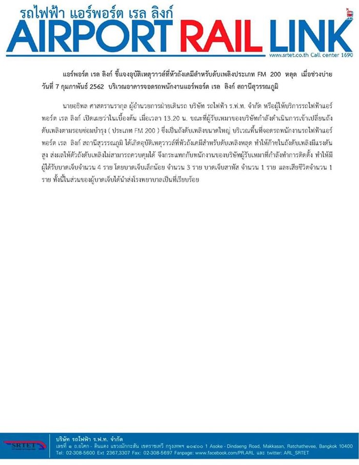 เกี่ยวกับเรื่องนี้ ทางเฟซบุ๊ก Airport Rail Link ได้ออกแถลงการณ์ชี้แจงถึงเหตุที่เกิดขึ้น โดยระบุว่า แอร์พอร์ต เรล ลิงก์ ชี้แจงอุบัติเหตุวาล์วที่หัวถังเคมีสำหรับดับเพลิงประเภท FM 200 หลุด เมื่อช่วงบ่ายวันที่ 7 กุมภาพันธ์ 2562 บริเวณอาคารจอดรถพนักงานแอร์พอร์ต เรล ลิงก์ สถานีสุวรรณภูมิ