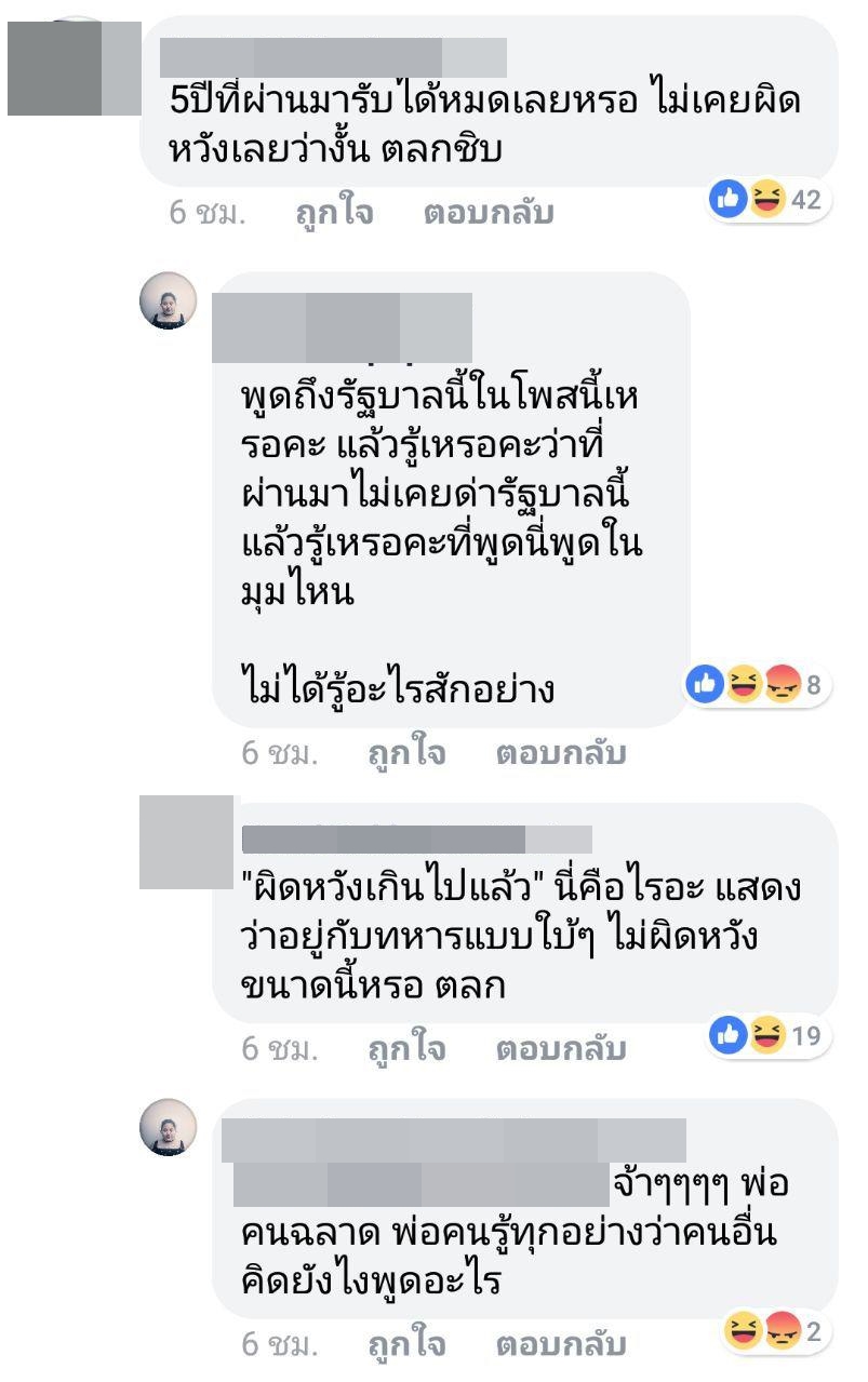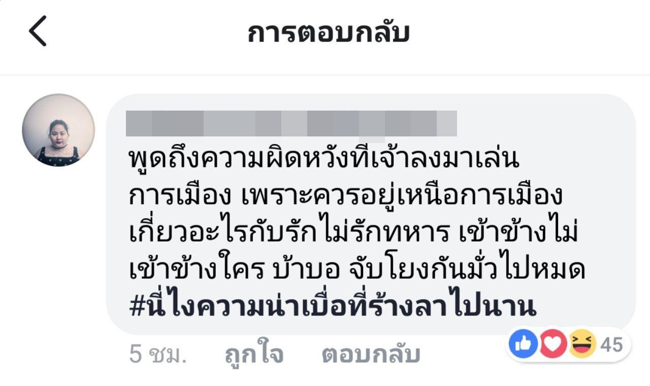 ทั้งนี้ ได้มีหลายคนเข้ามาคอมเมนต์ ทั้งที่เห็นด้วยและไม่เห็นด้วยกับโพสต์ดังกล่าว โดยสาวเอิน ได้ตอบกลับคอมเมนต์หนึ่งว่า "อยากจะร้องไห้แต่ร้องไม่ออก อยากจะกรี๊ดแต่เสียงไม่ดัง อยากจะพูดแต่พูดไม่ได้" และเมื่อมีคนโยงโพสต์ของเธอไปในเรื่องเกี่ยวกับรัฐบาลชุดนี้ เอิน ก็ตอบกลับว่า "พูดถึงรัฐบาลนี้ในโพสนี้เหรอคะ แล้วรู้เหรอคะว่าที่ผ่านมาไม่เคยด่ารัฐบาลนี้ แล้วรู้เหรอคะที่พูดนี่พูดในมุมไหน ไม่ได้รู้อะไรสักอย่าง" และยังได้ขยายความในคอมเมนต์ของตัวเองว่า ที่โพสต์ครั้งนี้ เพราะพูดถึงความผิดหวัง ไม่ได้เกี่ยวกับรักหรือไม่รักทหาร หรือการเข้าข้างไม่เข้าข้างใคร