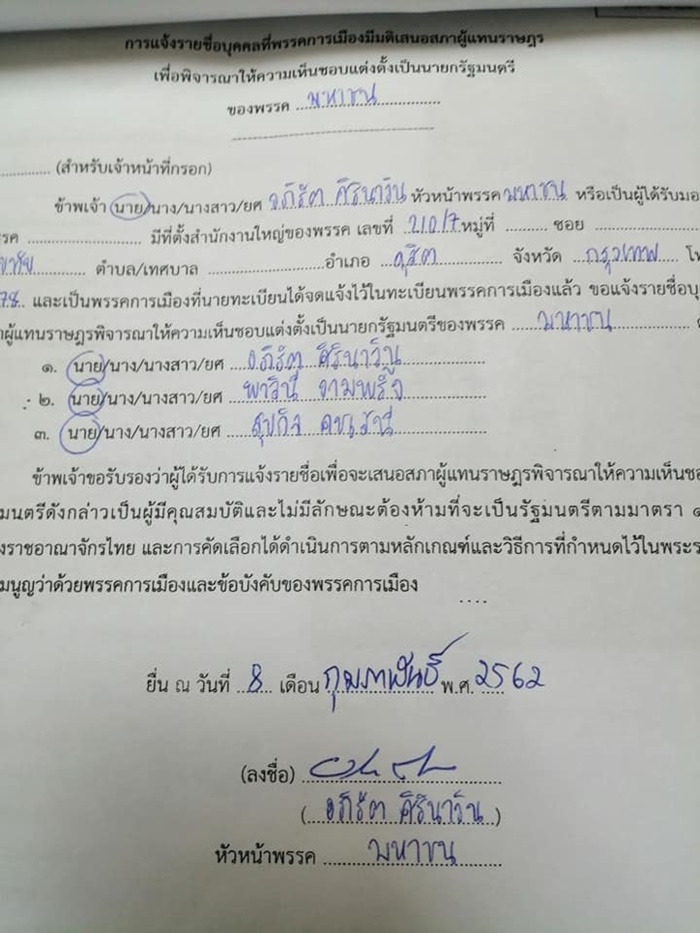 มีการโพสต์ภาพใบสมัครนายกรัฐมนตรี ในนามพรรคมหาชน พร้อมข้อความว่า "ผู้สมัครนายกรัฐมนตรีข้ามเพศคนแรกของโลก"
