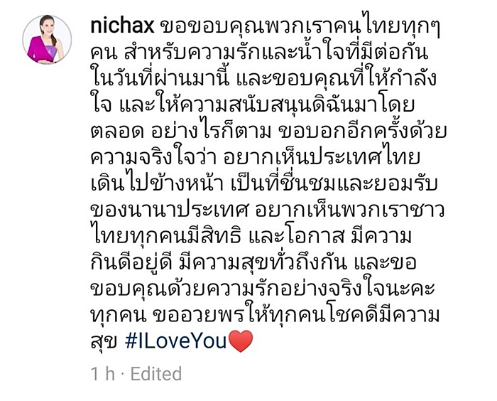 "ขอบคุณพวกเราคนไทยทุก ๆ คนสำหรับความรักและน้ำใจ ที่มีต่อกันในวันที่ผ่านมานี้ และขอบคุณที่ให้กำลังใจ และให้ความสนับสนุนดิฉันมาโดยตลอด อย่างไรก็ตาม ขอบอกอีกครั้ง ด้วยความจริงใจว่า อยากเห็นประเทศไทยเดินไปข้างหน้า เป็นที่ชื่นชอบและยอมรับของนานาประเทศ อยากเห็นพวกเราชาวไทยมีสิทธิ และโอกาส มีความกินดีอยู่ดี มีความสุขทั่วถึงกัน และขอขอบคุณด้วยความรักอย่างจริงใจทุกคน ขออวยพรให้ทุกคนโชคดี มีความสุข"