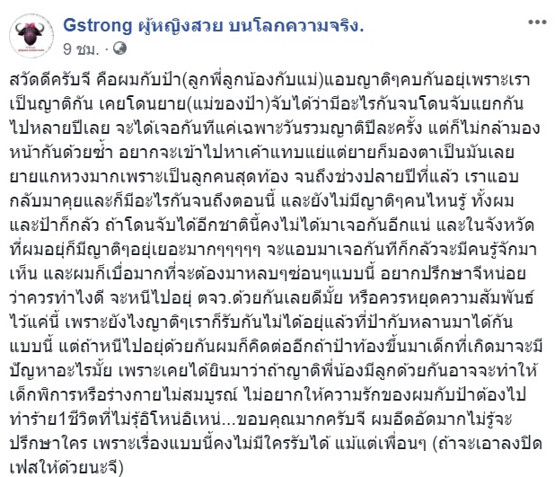 วันที่ 10 กุมภาพันธ์ 2562 เฟซบุ๊ก Gstrong ผู้หญิงสวย บนโลกความจริง. ได้มีการเผยเรื่องราวที่มีคนทักเข้ามาขอคำปรึกษา โดยเล่าว่า "ผมกับป้า