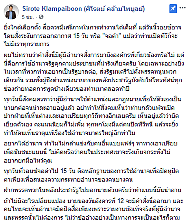 ได้โพสต์เฟซบุ๊กส่วนตัว "Sirote Klampaiboon (ศิโรตม์ คล้ามไพบูลย์)" ระบุว่า วอยซ์ ทีวี อาจโดนสั่งระงับการออกอากาศ 15 วัน