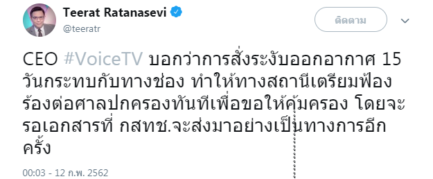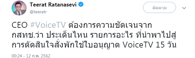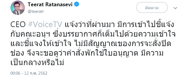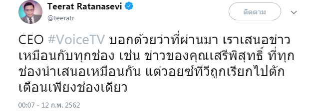 ช่องวอยซ์ ทีวี ก็ได้ทวีตข้อความผ่านทวิตเตอร์ส่วนตัว Teerat Ratanasevi ว่า ที่ผ่านมาทางช่องนำเสนอข่าวแบบแฟร์ ๆ