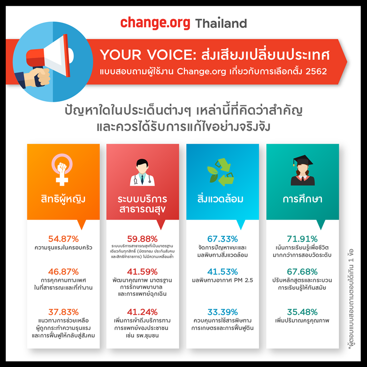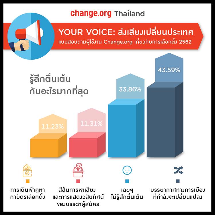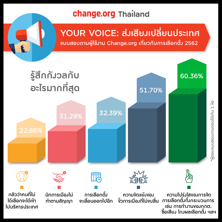 เมื่อวันที่ 12 กุมภาพันธ์ 2562 เว็บไซต์ change.org มีการเปิดเผยผลสำรวจภายในเว็บไซต์ เกี่ยวกับประเด็นเลือกตั้ง 2562 โดยประเด็นหัวข้อที่สำรวจนั้น เป็นเรื่องของความรู้สึกที่มีต่อการเลือกตั้งครั้งนี้ ข้อกังวลต่าง ๆ เกี่ยวกับปัญหาของประเทศ