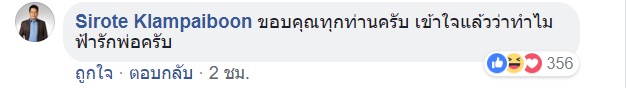 ซึ่ง นายศิโรตม์ คล้ามไพบูลย์ นักวิเคราะห์การเมืองรายการโทรทัศน์ชื่อดัง ได้เข้ามาคอมเมนต์ในเฟซบุ๊กของนายธนาธร ถึงกรณีนี้ด้วยว่า "ขอบคุณทุกท่านครับ เข้าใจแล้วว่าทำไมฟ้ารักพ่อครับ"