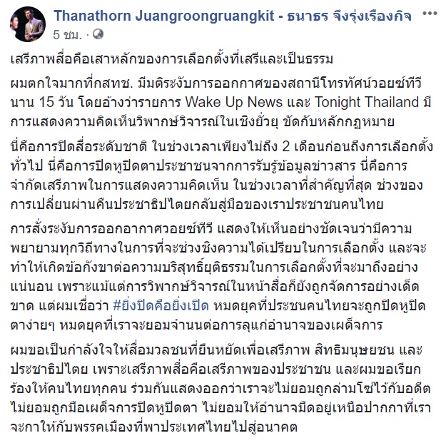 ผมตกใจมากที่ กสทช. มีมติระงับการออกอากาศของสถานีโทรทัศน์วอยซ์ ทีวี นาน 15