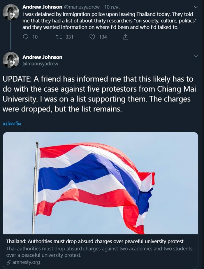 ดร.แอนดรูว์ เล่าว่า ทาง ตม. ชี้แจงเหตุผลในการกักตัวว่า เขาคือหนึ่งในนักวิชาการ 30 คนที่ทำวิจัยทางด้านสังคม วัฒนธรรม และการเมือง โดยทาง ตม. ยังต้องการรู้รายละเอียดถึงสถานที่ที่เขาไปเก็บข้อมูลและบุคคลที่เขาไปสัมภาษณ์พูดคุยด้วย ก่อนจะได้รับการปล่อยตัวในเวลาต่อมา ซึ่งขณะนี้เขาได้กลับมาที่สหรัฐฯ แล้ว