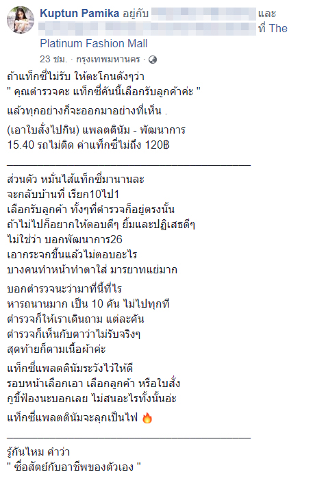 วันที่ 18 กุมภาพันธ์ 2562 สาวผู้ใช้เฟซบุ๊ก Kuptun Pamika เล่าเหตุการณ์ดังกล่าวระบุข้อความว่า เธอเองนั้น ต้องการเรียกแท็กซี่จากแพลทินัม กลับไปที่ซอยพัฒนาการ 26 ทั้งที่ค่าแท็กซี่ไม่แพงเพียง 120 บาท แถมรถไม่ติด แต่ไม่ว่าจะเรียกสักเท่าไร แท็กซี่ส่วนใหญ่ก็จะปฏิเสธ และปฏิเสธด้วยการเอากระจกขึ้นทันที ไม่ใช่การตอบดี ๆ จนเธอเองทนไม่ไหว