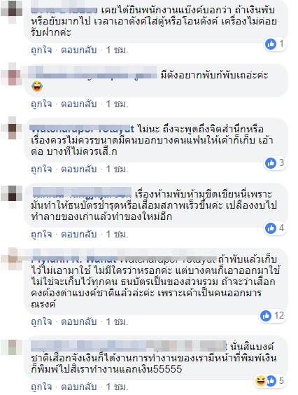 โดยแม่ค้าระบุข้อความว่า "การอ่านสำคัญต่อเด็กไทย !!" อย่างไรก็ตาม มีหลายคอมเมนต์บอกไม่ควรพับแบงก์ เพราะจะทำให้เสียหายง่ายกว่าปกติ อีกทั้งธนาคารแห่งประเทศไทยก็ออกมาขอความร่วมมือห้ามพับดอกไม้จากธนบัตรเช่นกัน