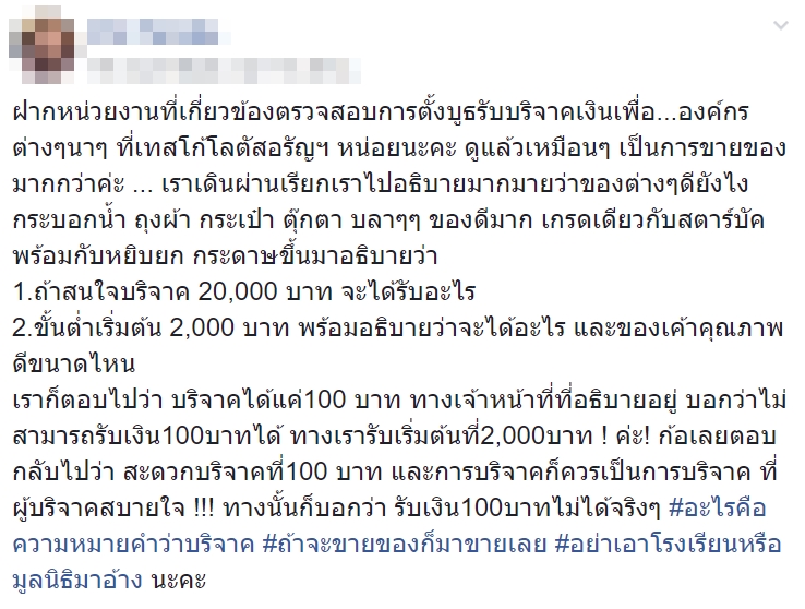 เจ้าหน้าที่ชี้แจง หลังโซเชียลแฉตั้งบูธรับบริจาคเงินในห้าง แต่ต้องขั้นต่ำ 2,000 โต้ไม่จริง ชี้เป็นกิจกรรม CSR ขายสินค้าการกุศลเพื่อนำเงินบริจาคให้มูลนิธิฯ ยันไม่ได้บังคับ