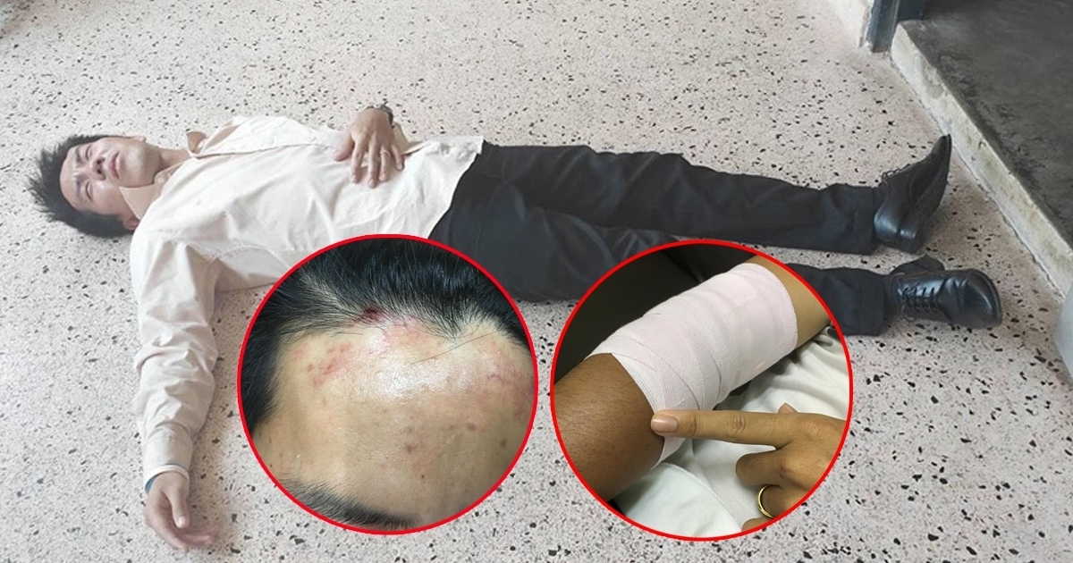 เปิดภาพครูหนุ่ม นอนหมดสภาพหลังเข้าระงับเหตุกลุ่มวัยรุ่นงานบวชบุกถล่มโรงเรียน ถูกซ้อมจนน่วม - แขนเกือบหัก