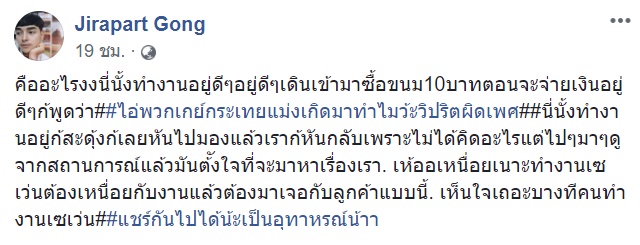 โดยเจ้าของเรื่องได้โพสต์ข้อความระบุด้วยว่า คืออะไรงงนี่นั่งทำงานอยู่ดี ๆ เดินเข้ามาซื้อขนม 10 บาท ตอนจะจ่ายเงินอยู่ดี ๆ ก็พูดว่า ไอพวกเกย์ กะเทย แม่งเกิดมาทำไมวะ วิปริตผิดเพศ นี่นั่งทำงานอยู่ก็สะดุ้งก็เลยหันไปมอง แล้วเราก็หันกลับ เพราะไม่ได้คิดอะไร แต่ไป ๆ มา ๆ ดูจากสถานการณ์แล้วมันตั้งใจที่จะมาหาเรื่องเรา เห้ออ เหนื่อยเนาะทำงานเซเว่นต้องเหนื่อยกับงานแล้วต้องมาเจอกับลูกค้าแบบนี้ เห็นใจเถอะบางทีคนทำงานเซเว่น ##แชร์กันไปได้นะเป็นอุทาหรณ์น้าา