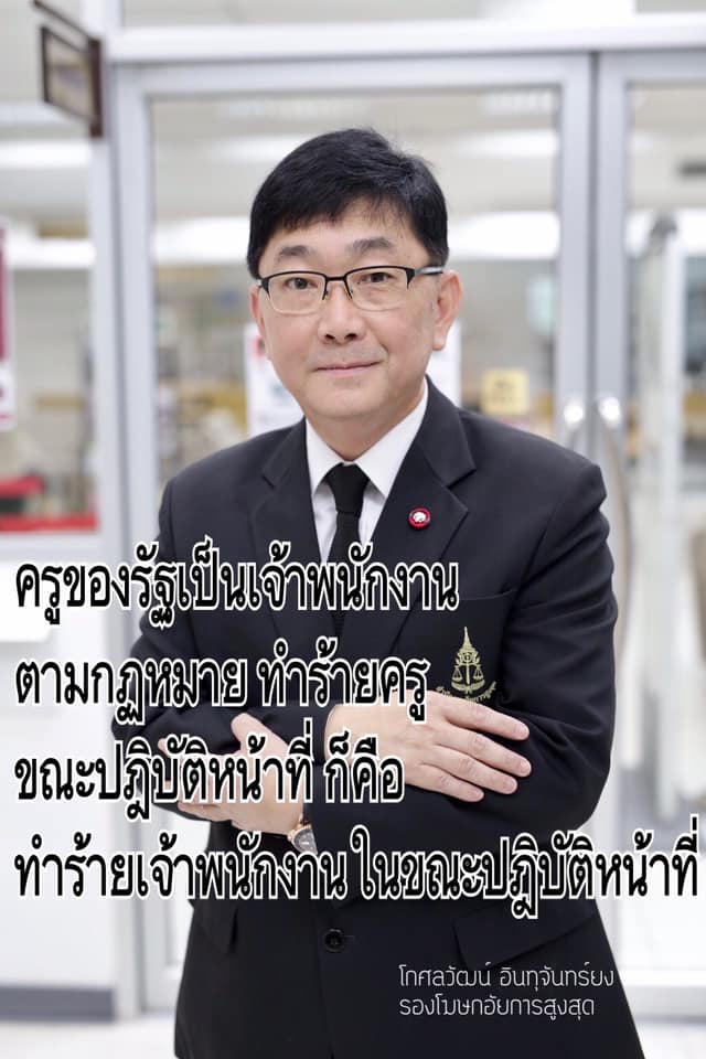 ด้านนายโกศลวัฒน์ อินทุจันทร์ยง รองโฆษกอัยการสูงสุด ได้โพสต์ภาพพร้อมข้อความระบุว่า ครูของรัฐ ถือเป็นเจ้าพนักงานตามกฎหมาย ทำร้ายครูขณะปฏิบัติหน้าที่ก็คือ ทำร้ายเจ้าพนักงานในขณะปฏิบัติหน้าที่