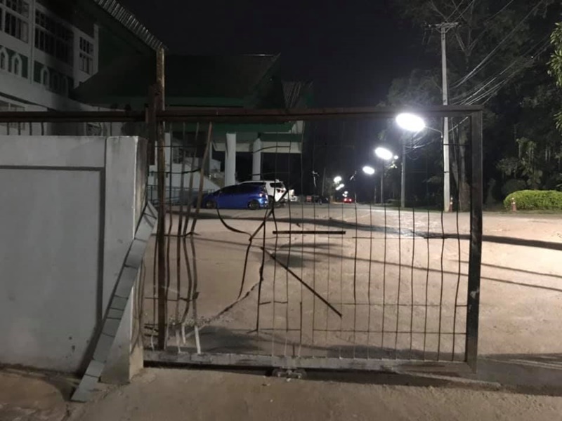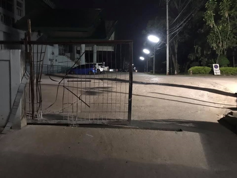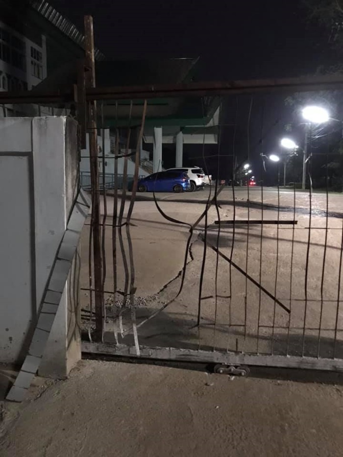 พบรั้วเป็นลักษณะกรงเหล็กถูกชนจนเป็นรูโหว่ พร้อมระบุข้อความว่า "เมื่อคืนไม่ทราบว่าใครมาทะลุมิติประตูมหาลัย